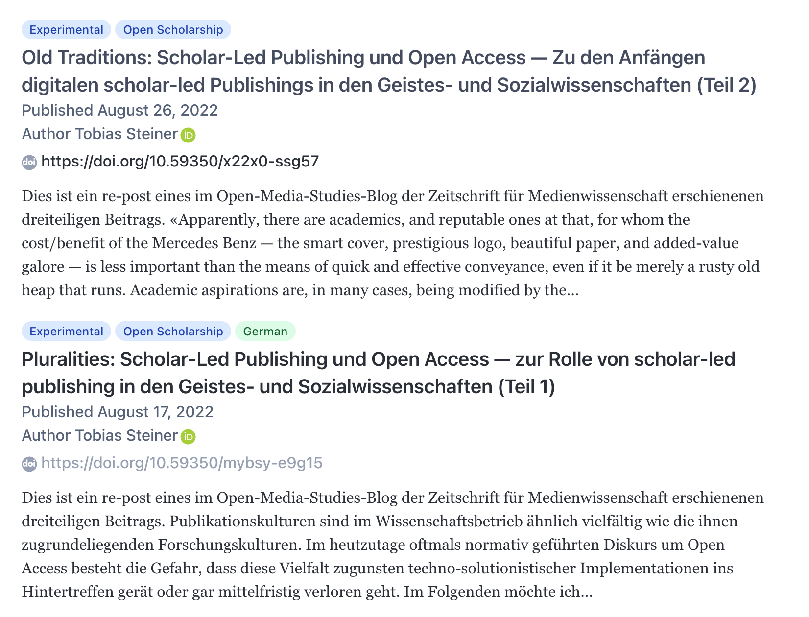 In the past weeks, I have worked on translating the Rogue Scholar user interface. The currently supported languages are English and German, and I am particularly interested in including science blogs written in other languages. It is of course also possible to write individual posts in other languages, Rogue Scholar will automatically detect the language and display it if different from the preset language: