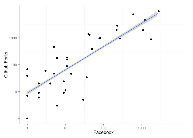We can find Facebook activity (likes, comments or shares) for one third of the repositories. There is a reasonably good correlation between Facebook activity and number of Github forks: