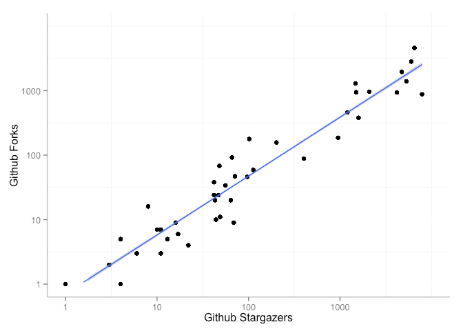 The vast majority of software repos in this analysis are hosted by Github, so we have the numbers of stars and forks for those. It is interesting, although probably not very surprising, that the number of Github stargazers and forks is highly correlated: