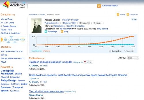 It is not only a waste of resources (both Google Scholar’s and the individual researchers’ who maintain their profiles) to many many different bibliographic databases, but it also makes it impossible to compare citation metrics. In the examples above Alonzo Church has a H-index of 19 at Google Scholar, but only 11 at Microsoft Academic Search (and probably again a different one somewhere else). This means that we can only use an H-index when we mention where (and when) it was calculated.