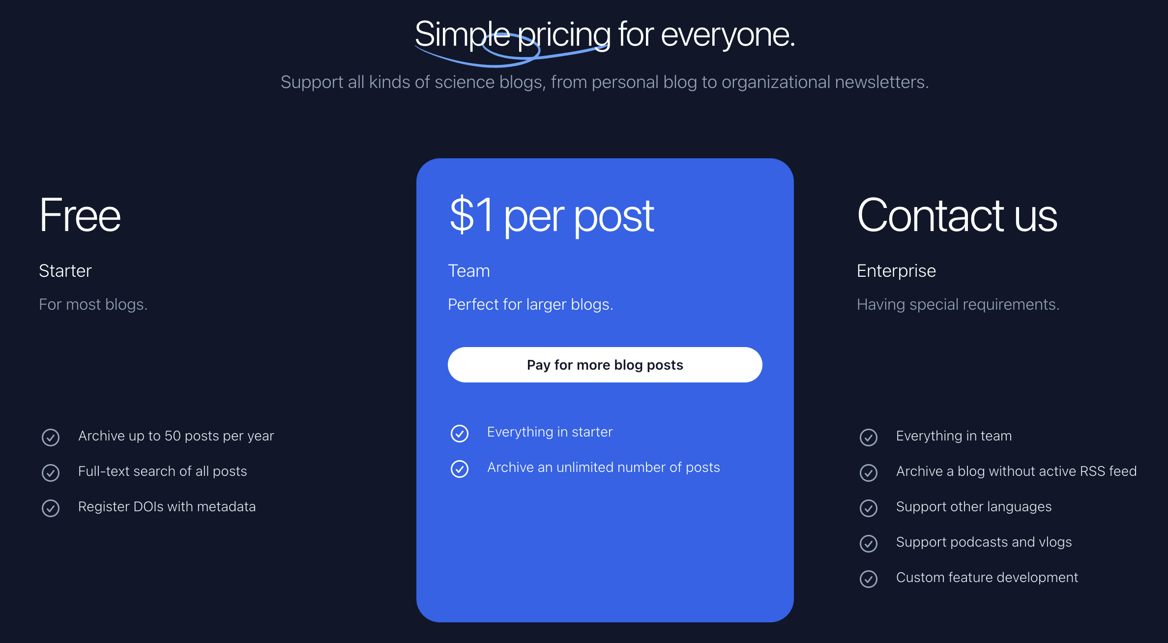Many science blogs are written by individuals in their "free" time as academics or science journalists. It wouldn't be appropriate to charge them for participating in Rogue Scholar, which is why Rogue Scholar is free for up to 50 blog posts published a year. If you publish more than 50 posts (or once per week) as an individual or organization, I hope you have a revenue source for the time spent writing and editing those posts and are willing to pay Rogue Scholar a one-time fee of $1 per post.