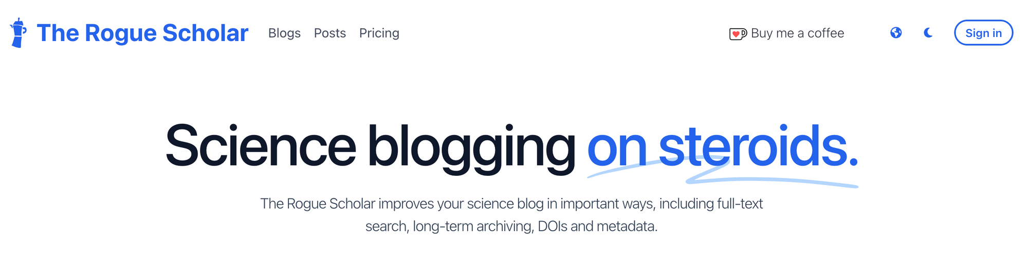 - Donations (one-time or monthly) of $3 or more if you want to support the Rogue Scholar as a reader. Follow the new buy me a coffee link in the navigation bar on top of all Rogue Scholar pages.