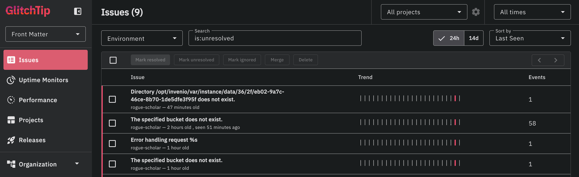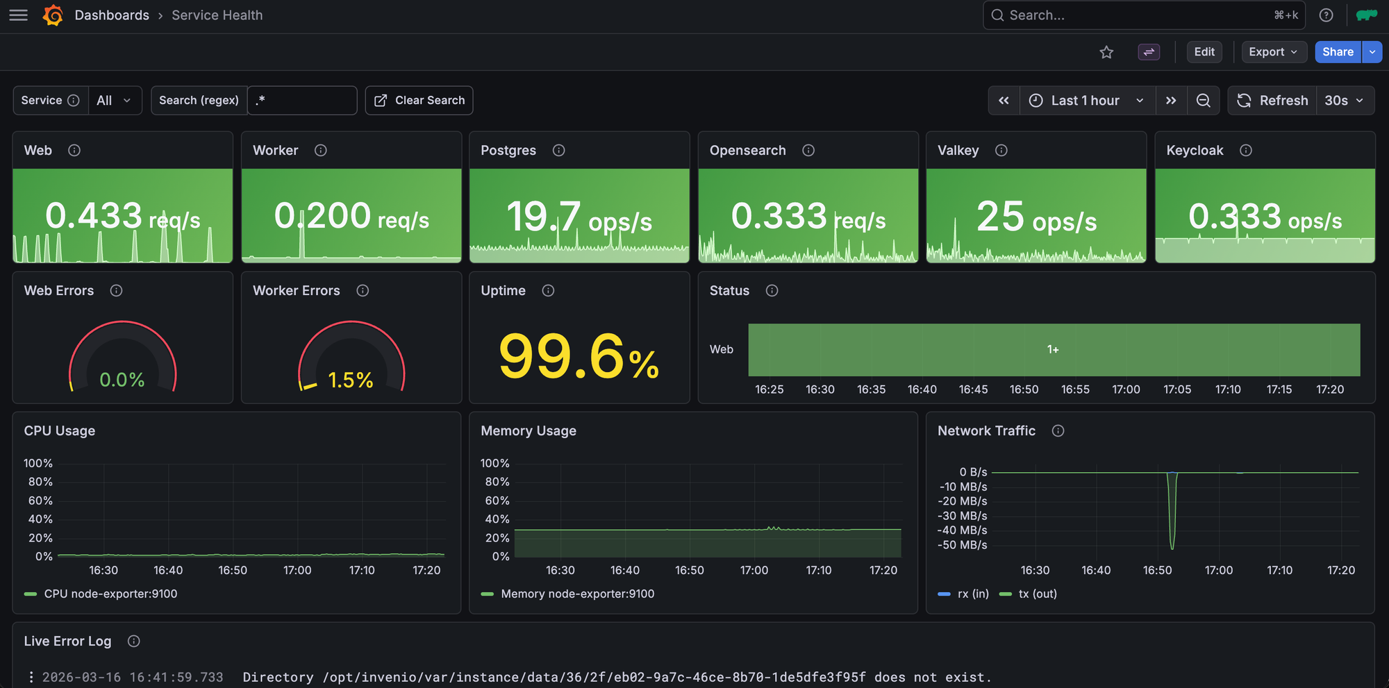The dashboard collects metrics (ViktoriaMetrics) and logs (ViktoriaLogs) from the InvenioRDM respository platform that powers Rogue Scholar, and monitors the service availability from an external uptime monitor. Errors are sent to the self-hosted GlitchTip service using the Sentry integration built into InvenioRDM.