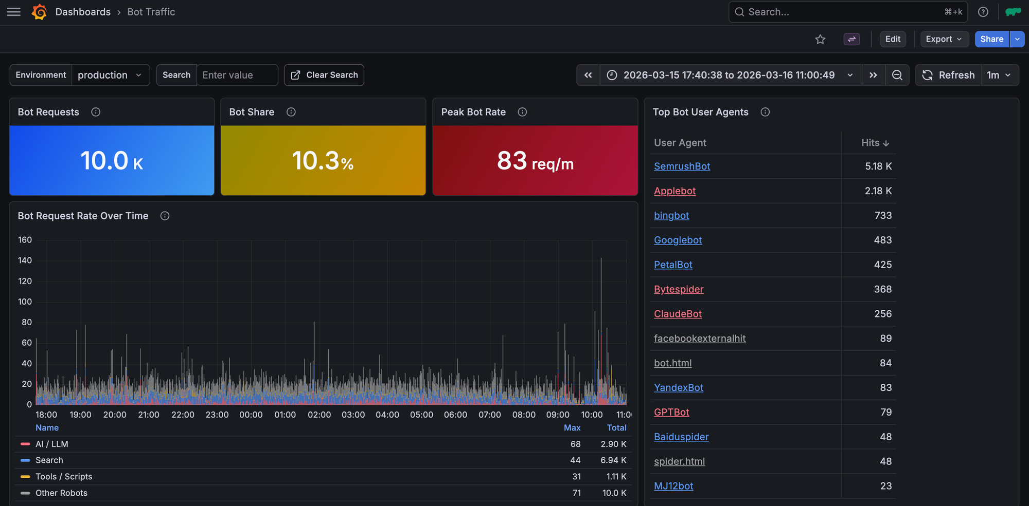This new infrastructure not only simplifies monitoring service health, but also makes easier specific investigations, for example exploring the bot traffic Rogue Scholar receives each day: