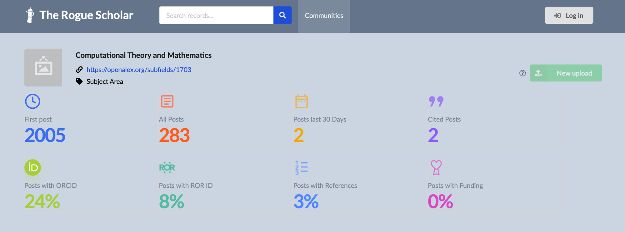 About 12 months ago Rogue Scholar introduced dashboards with summary statistics of the science blogging archive. At the end of 2025 these dashboards migrated to the Rogue Scholar landing page. Today Rogue Scholar is launching community dashboards – showing the same summary statistics by community. This feature works with all types of communities: blog, subject and topic communities.