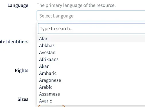 DataCite metadata can include the primary language of the resource, using either the BCP 47 (e.g. en-US) or ISO 639-1 (e.g. en) controlled vocabularies. In the context of discovery, the ISO 639-1 code is most helpful, as we want to find resources we can understand because we speak the language, and not necessarily care about the nuances of for example U.S. English vs. British English. In Fabrica, the DOI form uses the list of languages in ISO 639-1, and that is also what we will use for filters in search.