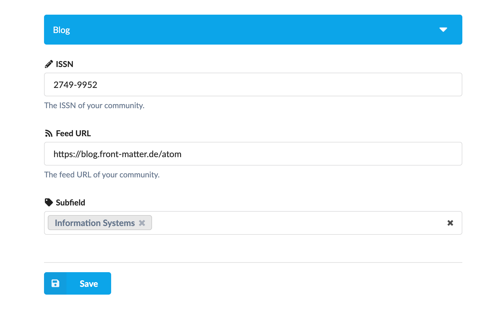 Starting this week, more information can be updated: besides the required blog feed URL the optional ISSN and the main OpenAlex subfield of the blog. This is provided by community custom fields, and the subfield uses the OpenAlex subfield vocabulary built into Rogue Scholar and also used for blog post classification.