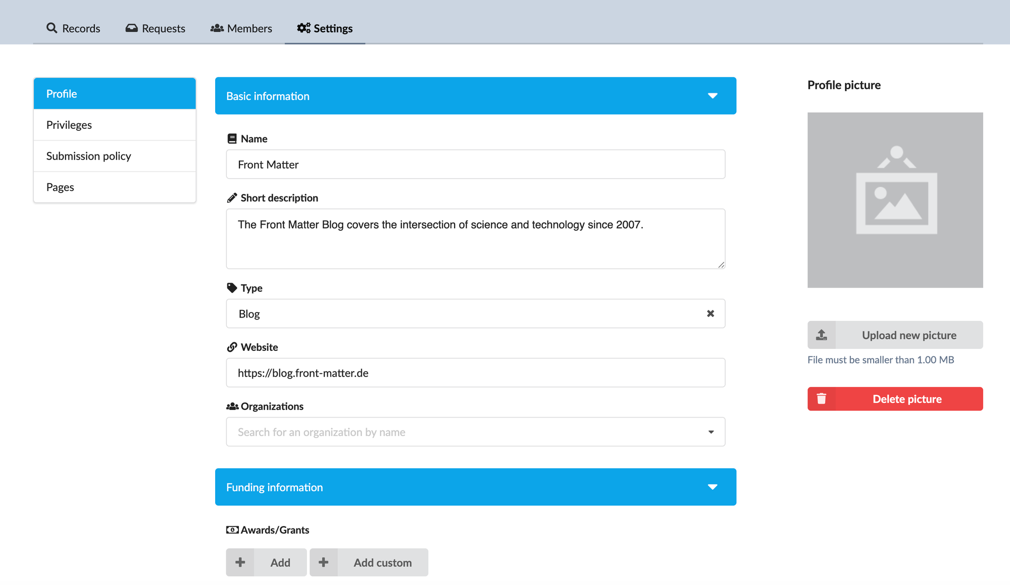 Rogue Scholar uses the community functionality of the InvenioRDM repository platform to manage science blogs and their associated blog posts. In the community settings one can configure basic metadata such as blog name, description, logo and URL.