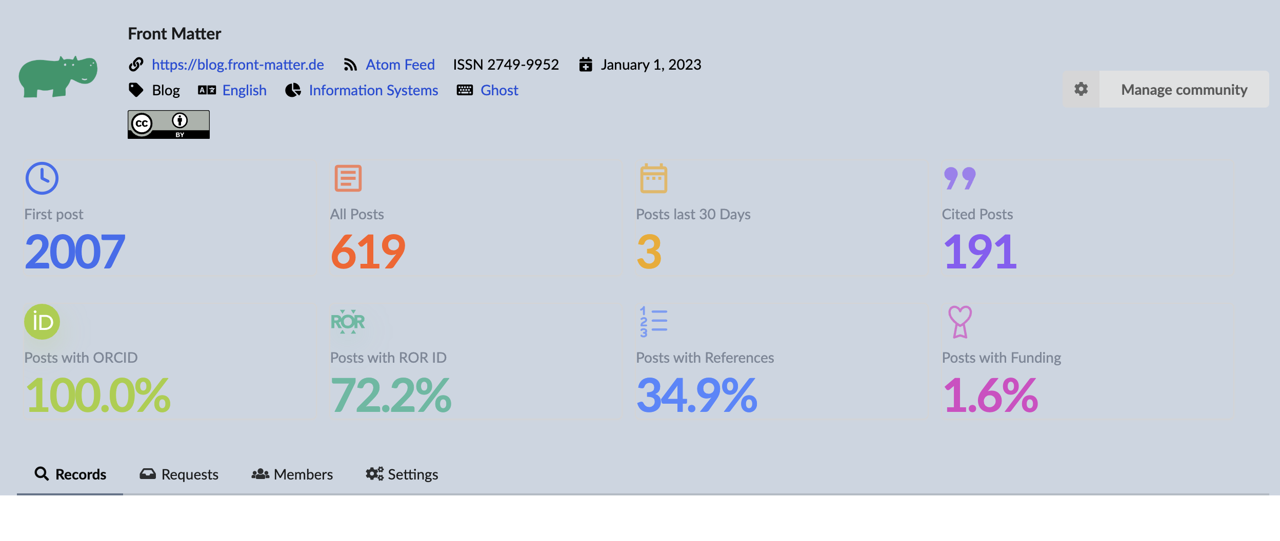 What community owners still can't do is adding or updating blog posts as this is done automatically via their blog feed. And adding a new blog to Rogue Scholar still requires filling out a submission form (at the bottom of every Rogue Scholar page), as blog authors have to agree to provide the full-text in the blog feed with a CC-BY license, submissions are not automatically accepted, and minimal one-time setup work is required.