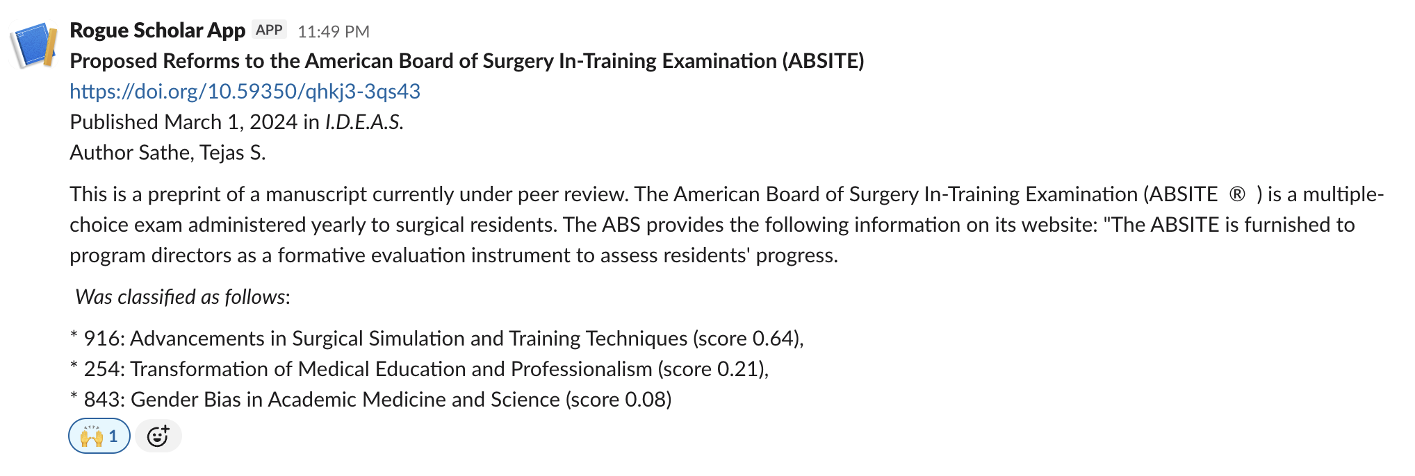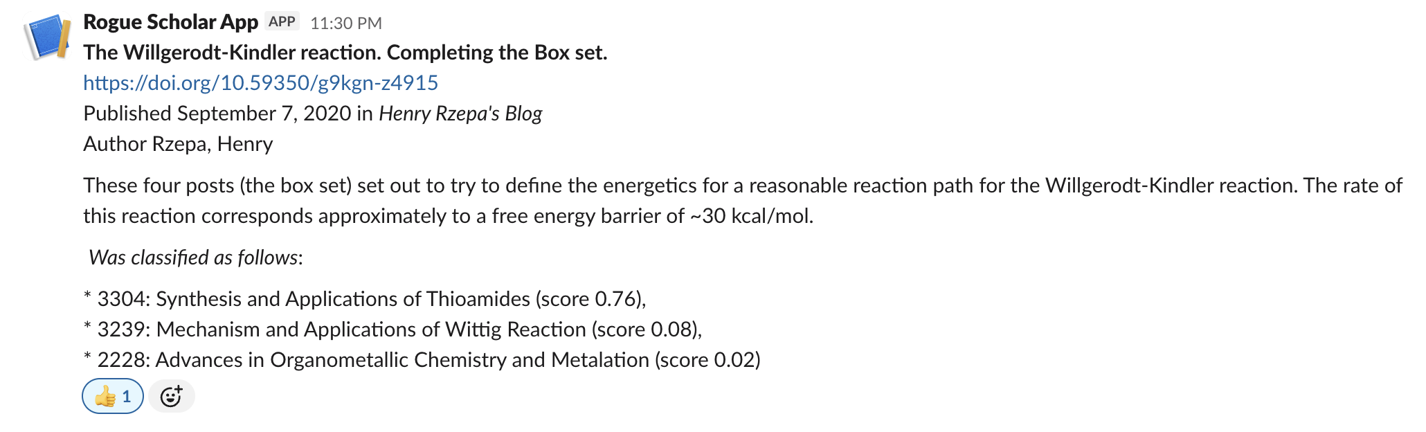 For community validation I wrote an integration into the Rogue Scholar Slack (join via this link) using the workflow automation service n8n, also self-hosted on Rogue Scholar infrastructure.