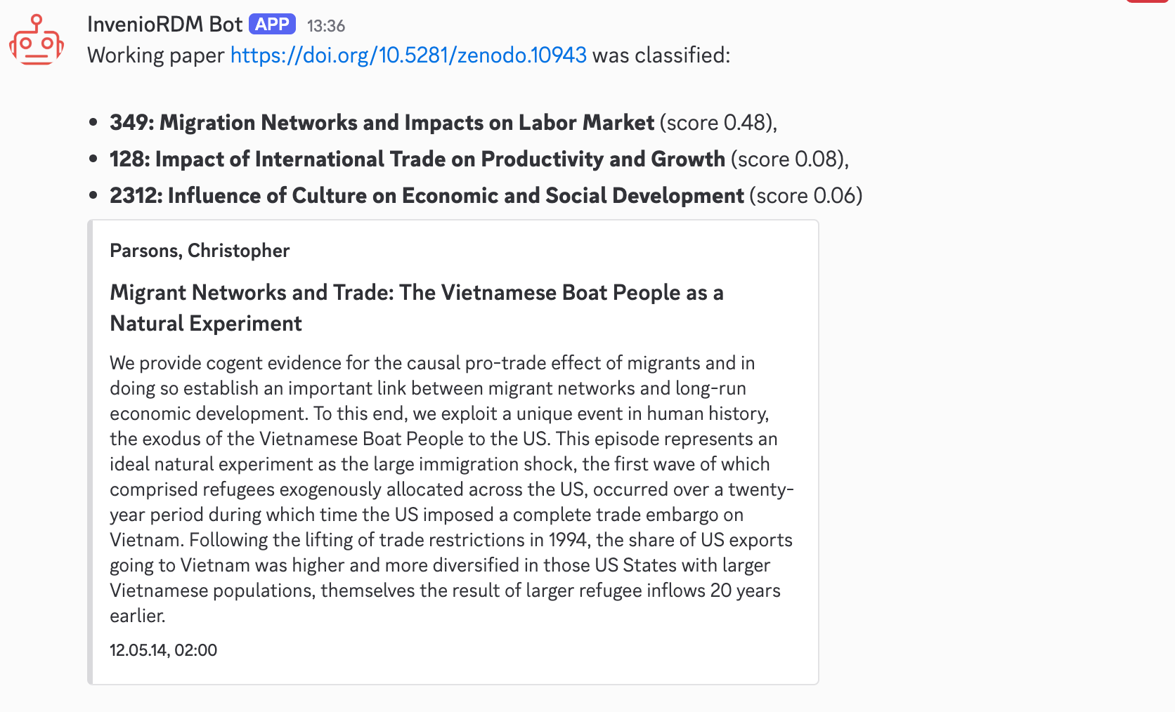As this might also be of interest to other repositories running the InvenioRDM software, I also built a similar integration into the Inveniosoftware Discord server, testing the classification with a few Zenodo records: