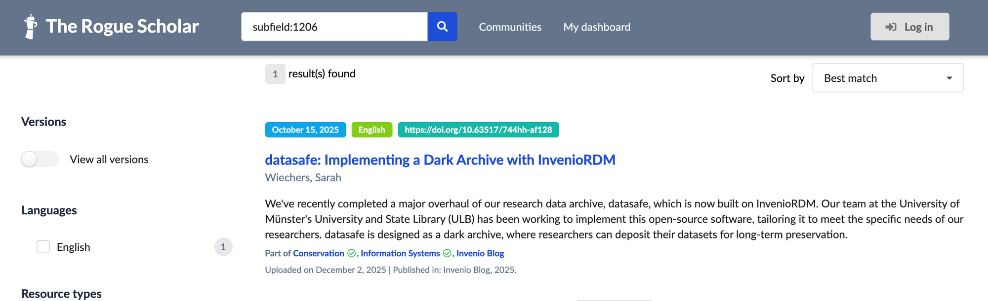 The post is also added to the corresponding subfield communities, in the example above Information Systems and Conservation. The community ID corresponds to the OpenAlex subfield ID (here 1206), and OpenAlex IDs can also be used in Rogue Scholar Search: