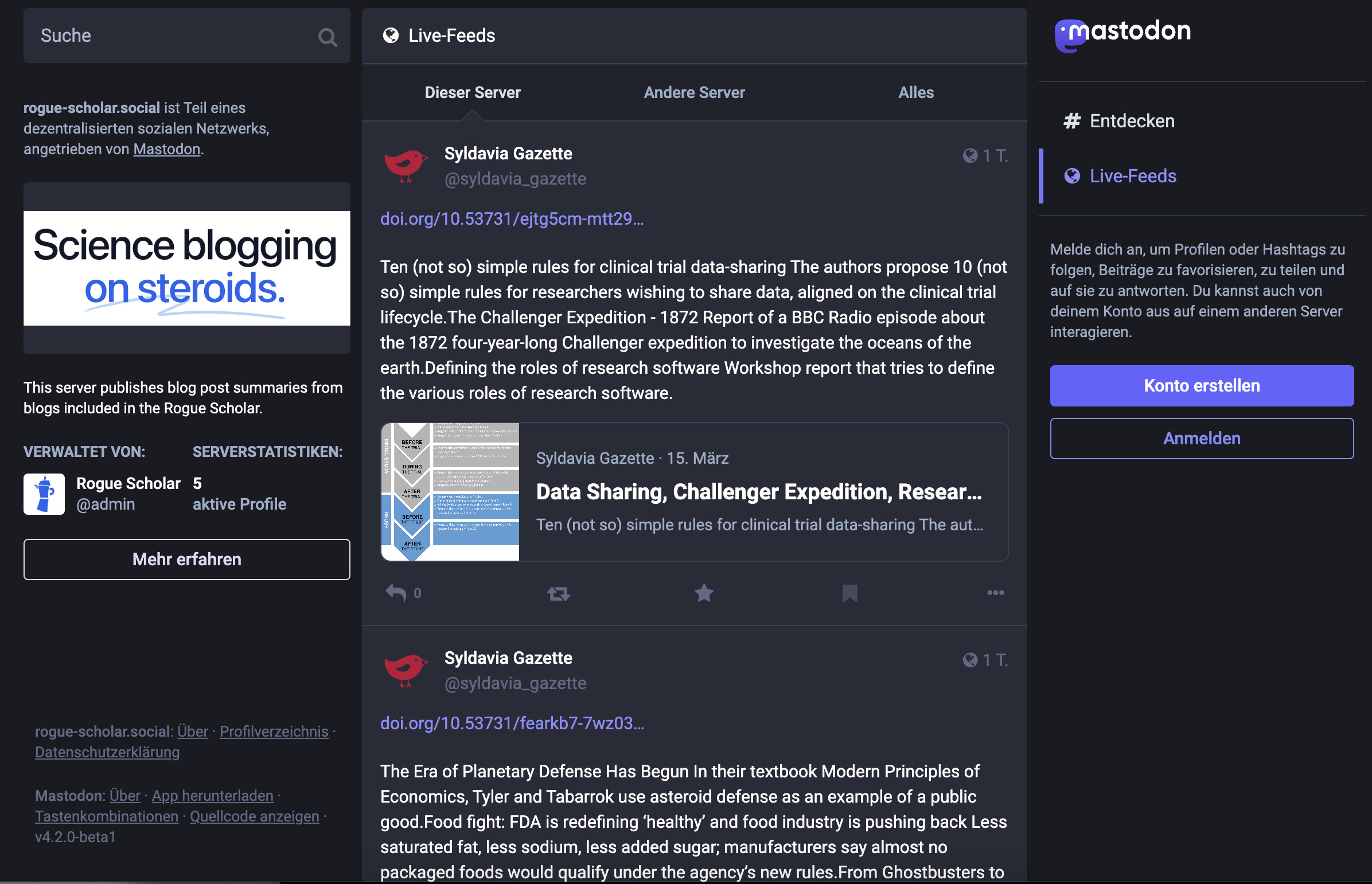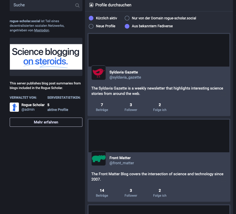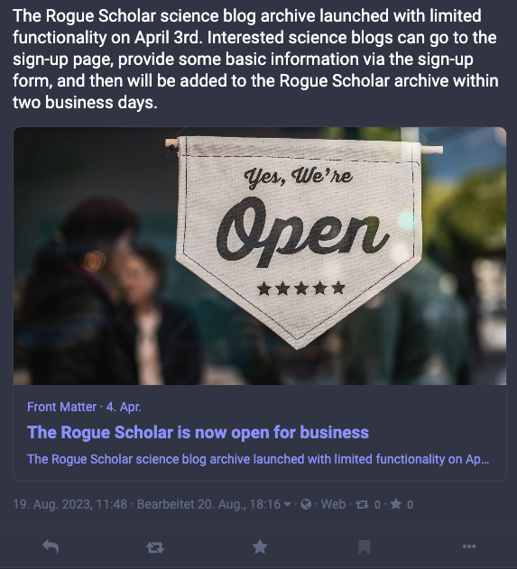 Today I am happy to announce that the Rogue Scholar science blog archive has joined the Fediverse, the federated social network that communicates using the ActivityPub protocol. I have launched a Mastodon instance at Rogue Scholar Social that accepts Science Blog bots as accounts, publishing summaries of blog posts.