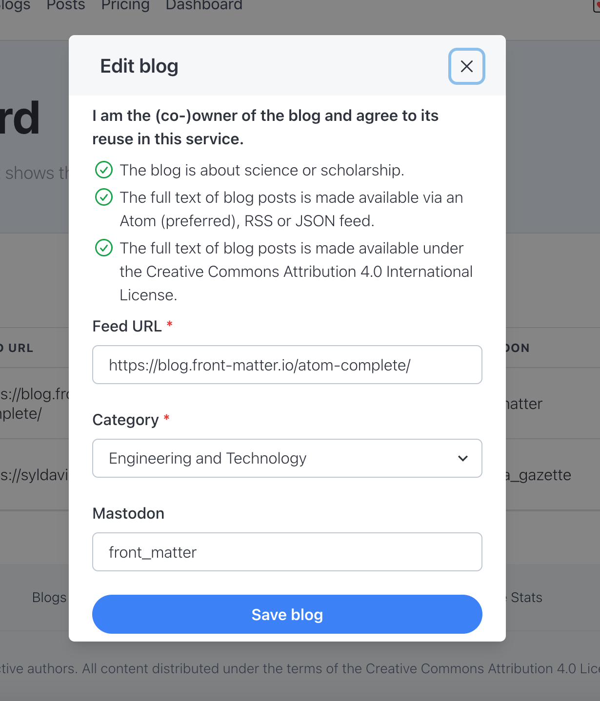 The Rogue Scholar Mastodon instance is different from most other Mastodon instances in that it is not open for new users to join. It doesn't have personal accounts, only bots for blogs that participate in the Rogue Scholar science blog archive. To create a Mastodon account for your blog, open your blog configuration in the Rogue Scholar dashboard (login via the sign in link on the Rogue Scholar homepage) and enter a unique name (only lowercase letters and underscore are allowed). Account creation and posting messages for new blog posts are not automated yet, but there is nothing else for blog authors to do.