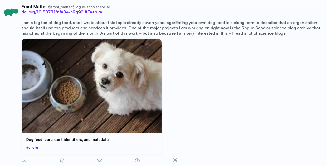 - Look into features currently missing but important for science blogs such as integration with full-text search and support for more metadata. The Rogue Scholar Mastodon instance is running the latest beta version of Mastodon (v4.2.0-beta1), which displays more information in the preview card (blog name, publication date, and beginning of description):