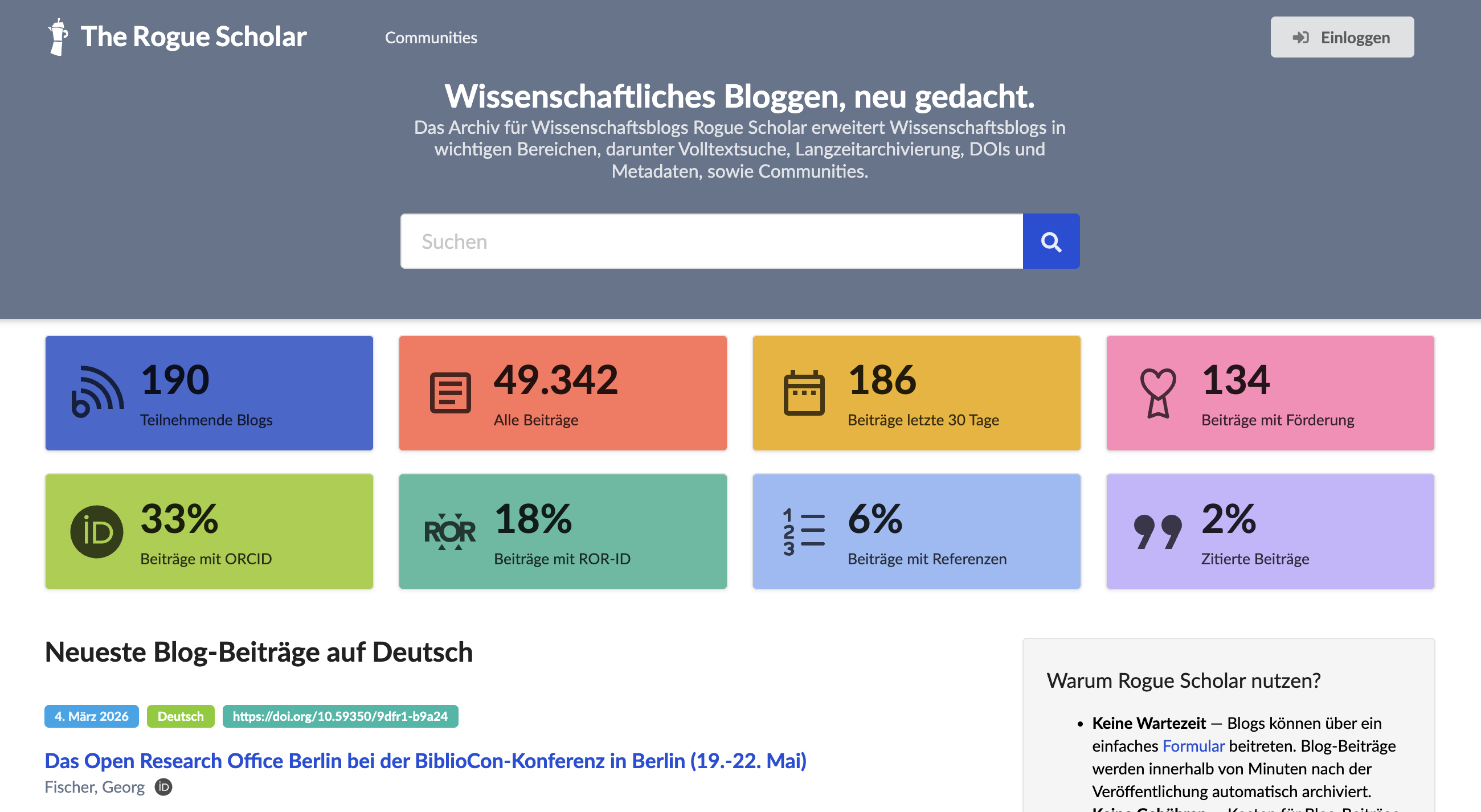 No blog was added in February. This leaves the number of participating blogs to 190, the number of archived posts has grown to 49,342 – Rogue Scholar is getting closer to the big milestones of 200 participating blogs with 50,000 posts!