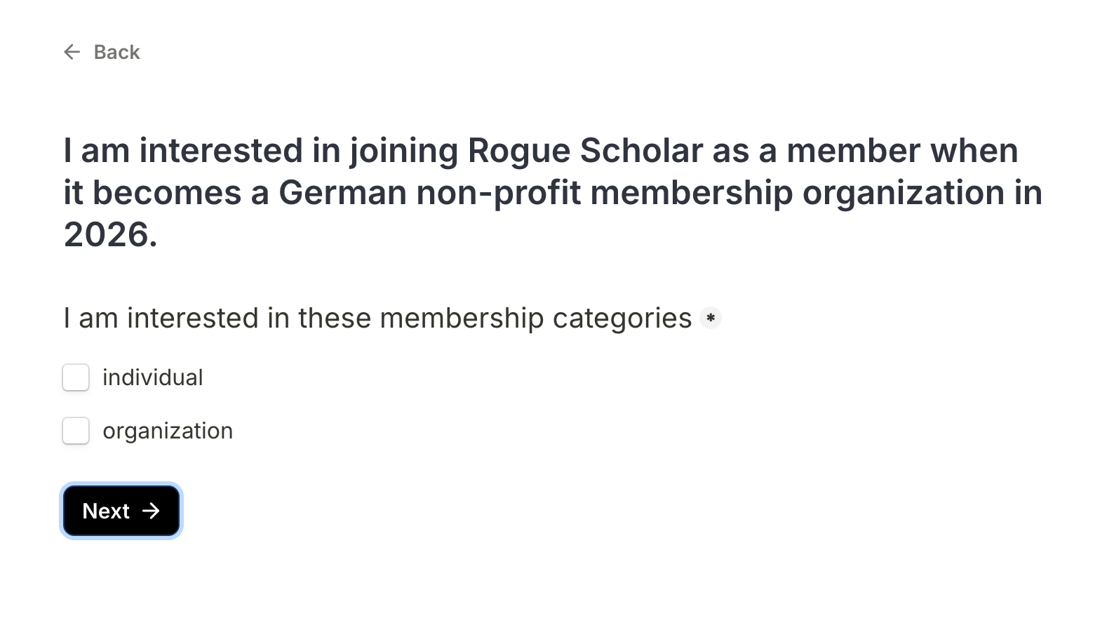 Work on Rogue Scholar becoming a German non-profit organization in 2026 is slowly progressing. While we work on the legal documents needed to register as a German non-profit, you can express your interest in joining Rogue Scholar as an individual or organization via a form link (Membership Interest Form) from the footer of every Rogue Scholar page.