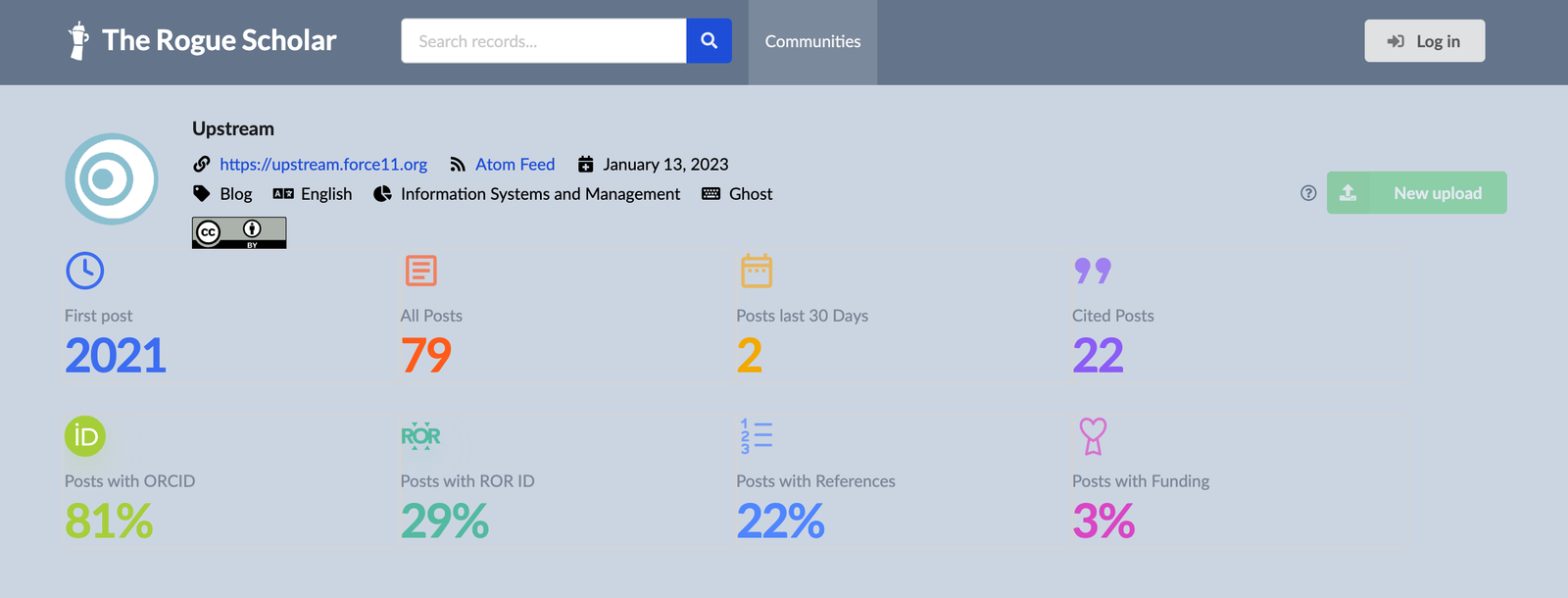 This makes it much easier for readers to get an overview for each blog participating in Rogue Scholar, and for blog authors to see gaps in metadata coverage that they can improve.