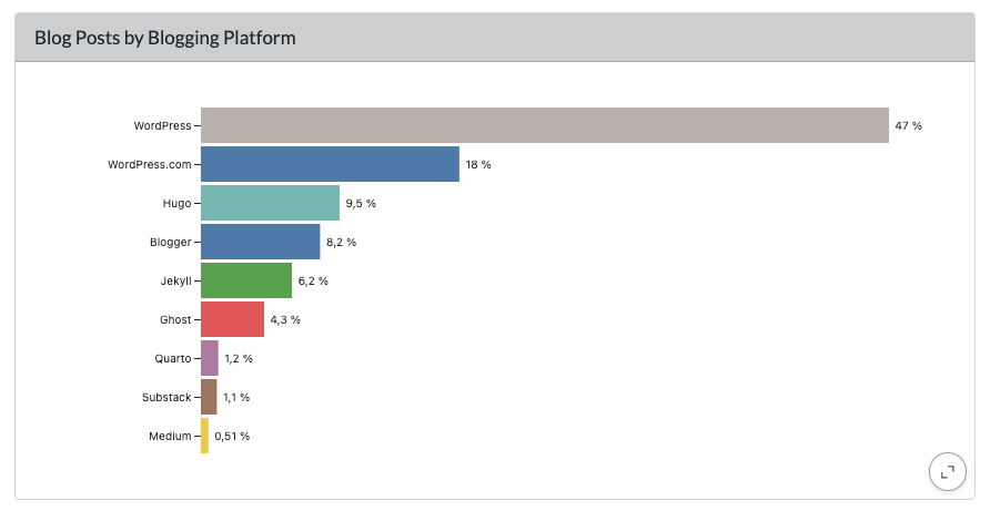 WordPress is the most popular blogging platform with blogs archived by Rogue Scholar, either the self-hosted version (WordPress) or the hosted version (WordPress.com). Again, there might be a selection bias at work.