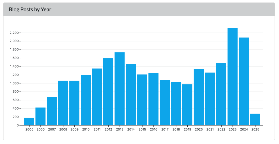 This page is new and shows the number of blog posts by year. Not surprisingly the number of posts has been the highest in the last two years, as Rogue Scholar launched in 2023. However over 40% of posts are over ten years old, highlighting content where long-term archiving is critical and Rogue Scholar can provide a valuable service.