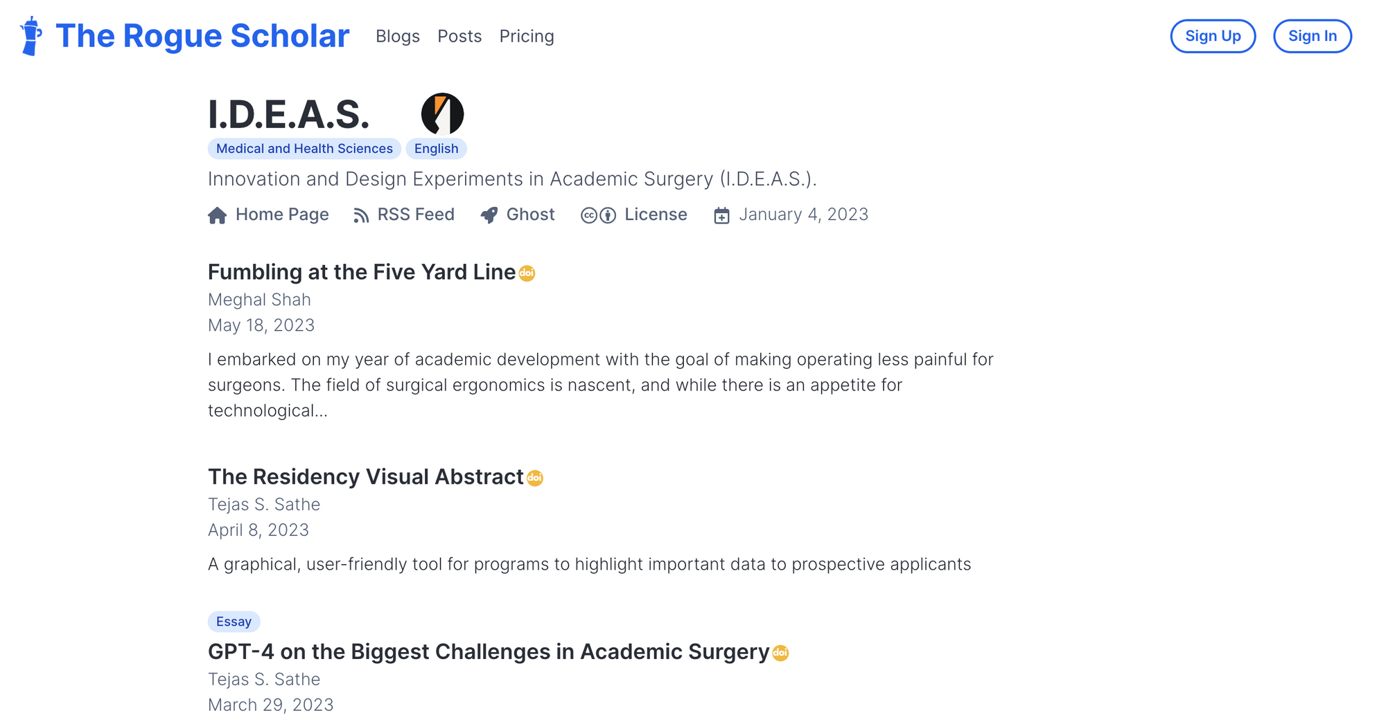Initial work on DOI registration for blog posts focussed on exposing the relevant metadata on the blog landing page, using schema.org and/or HTML meta tags. While this approach worked well for this and similar blogs, it was too complicated and didn't scale well for the large and diverse number of blogs the Rogue Scholar aims to cover.