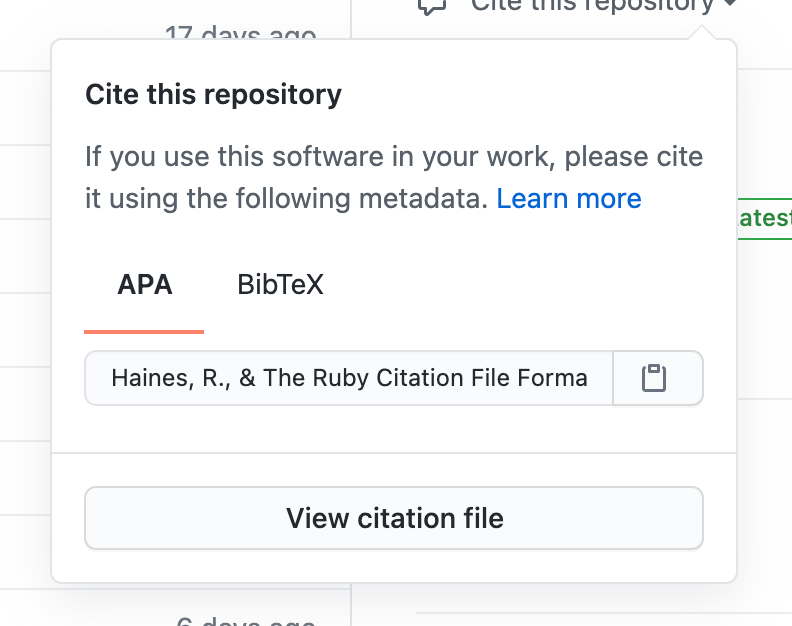 On August 19, GitHub announced software citation support in GitHub repositories. Citation information provided by users (using a CITATION.cff YAML file in the root directory of the default branch) is parsed and made available as bibtex file or formatted citation, currently supporting the APA citation style. The APA style is a good start as it is the only popular citation style that labels software with the string [Computer software] but we hope to see support for more citation styles – including those popular in computer science – going forward. Going forward we also hope to see support for biblatex and potentially @software as the bibtex entry type.
